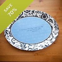 $7.99. Size: approximately 16 ¼” x 12 ¼” diameter. Plate features the word “Life” in more than 15 different languages. Material: ceramic. Dishwasher safe.
