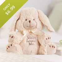 Jesus Loves Me – Musical Bunny Plush. Size: approx. 9 1/2″H. Two 1.5V replaceable batteries, included. Materials: plush, satin ribbon. Turn battery pack on to activate sound