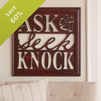 $11.99. Ask, Seek, Knock – Wood Carved Wall Hanging. Size: 21″ x 21″. Hue: dark brown with red tones. Brackets attached for easy hanging.