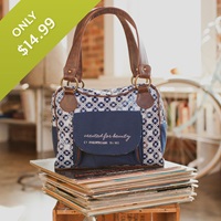 Beautiful durable purse. Size: 11 5/8″L x 8 3/4″H; 18″ double strap handles, with 9″ drop. Embroidered message. Materials: Durable canvas, oil-cloth, faux leather.