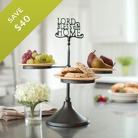 $19.99. Bless This Home – Tiered Server. Size: Height – 17 1/2″H. Base – 7 5/16″ diameter. Exensions – approximately 5 1/4″ diameter; each extends approx. 8 3/4″. Hue: antiqued silver. Material: hammer textured metal. Movable extensions