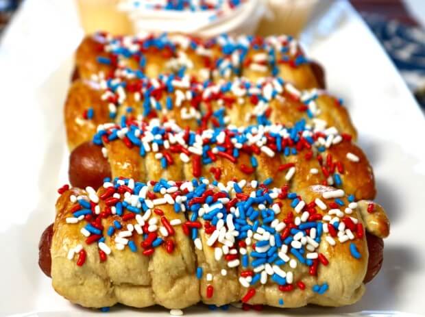 Let your love of the red, white and blue shine with this easy recipe for Spiral Pretzel Hot Dogs.