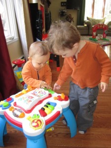 The boys also played music on our Leap Frog Learn-N-Play table and they learned about making patterns using a pattern board and some toy bolts that you drill into the board.