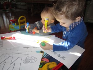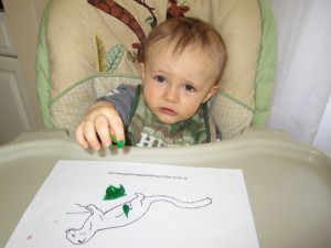 I’ve been asked by a few moms how long it takes to do these activities. I’d say it’s anywhere from five to fifteen minutes per activity and I only do two or three a day. The rest is free play. Sometimes Peanut will take a real interest in something and spend more time at it, if he does, I let him lead. I’m just trying to introduce him to concepts and make it FUN. 😉