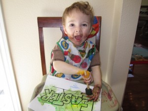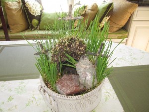 And finally, mommy, who has a brown thumb, actually managed to grow some wheat grass she purchased at Whole Foods to make this beautiful Easter Garden. 🙂