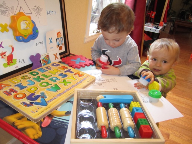 I think that having tools like this mainly helps me to be more intentional about the time I spend with my little ones. There are 12 categories and each week I plan activities that help us to do at least one activity in each category. For this week (Letter “X”) here is a picture of our play table for the week.