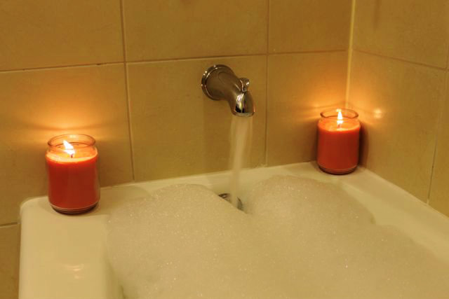 - Run a warm bubble bath and enjoy a soak in the tub. I placed candles along the ledge of the tub. They emitted a soft glow and the scent of Sweet Pea flowers.