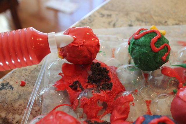 - Add your Final Chocolate Touches. I used a icing applicator to apply touch ups where needed. When one of my OREO cookie balls came apart as I dislodged it from the plastic egg crate, I repaired it and topped it with red chocolate using an frosting dispenser.