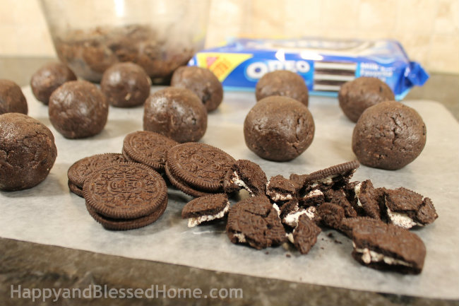 - Coat the OREO Cookie Balls in melted chocolate. By now your chocolate has melted and your OREO balls have been sitting in the freezer for 45 minutes or so. Now you can coat the OREO balls. I do not recommend rolling the balls in the chocolate. Instead, use a spoon or cupped spatula to pour chocolate onto the OREO Cookie Ball. A fork is effective at holding the cookie ball. Rotate the ball as you pour chocolate over it. I started with a fork but later switched to a thin skewer to hold the cookie ball.