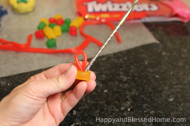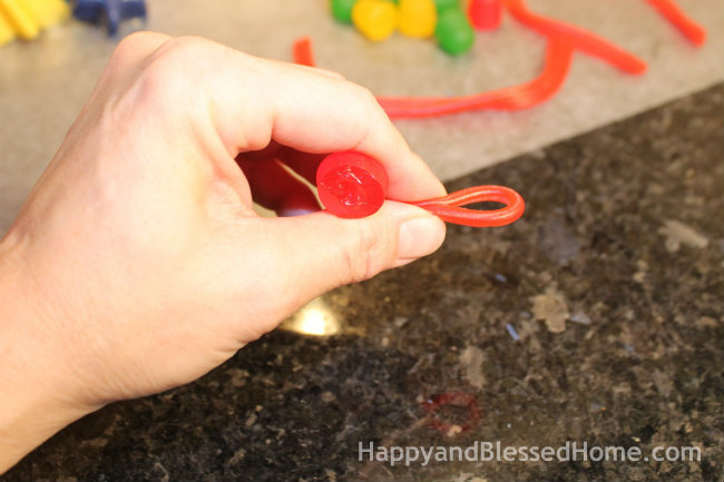 Create the candy topper for your ornaments. The top of the OREO cookie ball candy ornament is a piece of DOTS candy that has been trimmed. I cut the dome off the top. I then used a nut separator to poke a hole in the center of the candy. This nut separator also became a handy tool to help me thread a piece of licorice through the candy. Twizzlers makes a cherry flavored pull apart candy that is perfect for this task. Pinch the Twizzler tips together before threading it through. It makes the task a bit easier.
