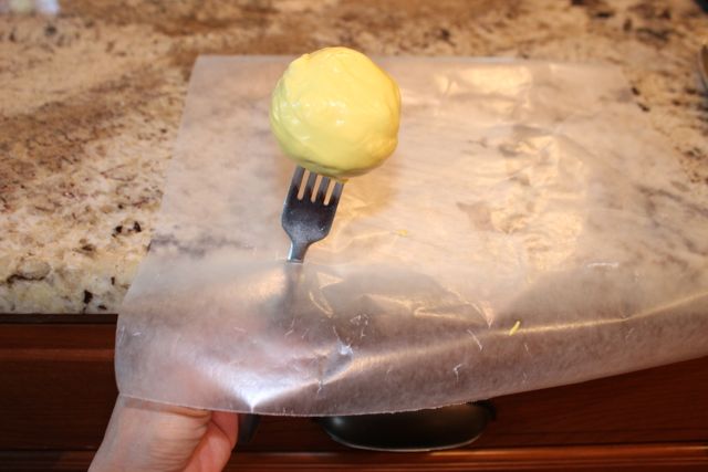 - Dry the Coated OREO Cookie Balls. Once coated, placing them to dry can be tricky. If you don’t mind an edge around the bottom you can try threading the fork through wax paper carefully off the edge of your counter – you’ll need both hands. I tried a few methods before I settled on using a plastic egg crate container. I poked holes in the top and used a skewer to spin each ball on over the stove. The whole process is quite messy if you do not own a Cake Pop StandDouble Boiler. As you can see here I used a full jar of carmel sauce to balance my plastic egg crate for my cookie balls. I used heavy duty kitchen scissors to cut the skewer once it was threaded through. I needed the end of the skewer to stay inside the cookie ball to hold it on the egg crate. The paint brush dipped in hot water came in handy for touch-ups.