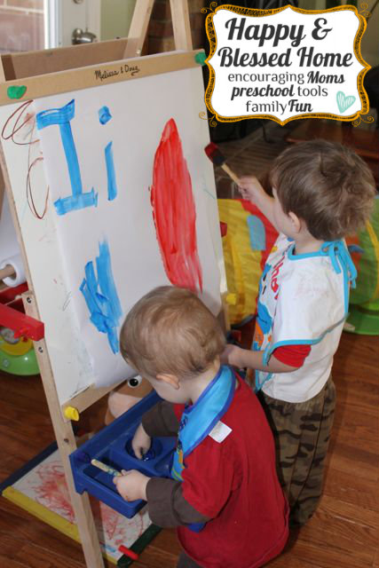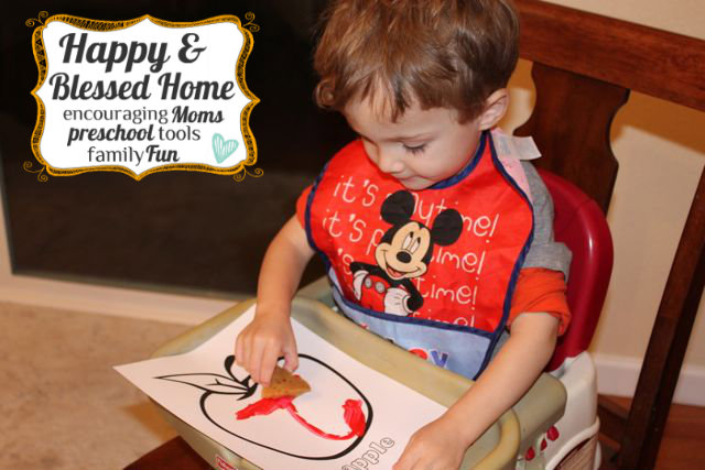 In October of last year we started with the Letter A – all of the printable packs include simple coloring pages to emphasize the alphabet letter being studied. Here a craft sponge is being used to paint an apple red.