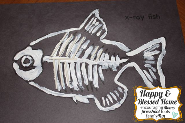 Every letter includes an easy letter craft. Here you can see an X-ray fish we created using white paint on a black piece of construction paper. We used Q-tips to create fish bones.