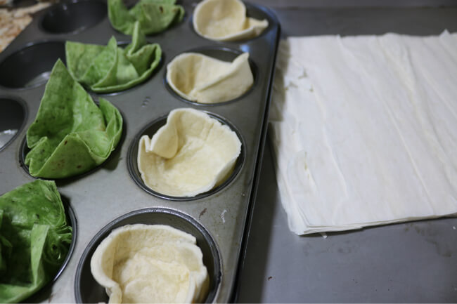 1. Load your “boats” into a cupcake pan. I cut the spinach wraps in half and tucked them into a cupcake pan. For the flour tortilla taco boats, I folded them gently and fit them into the cupcake pan. For the phyllo dough, I cut the sheet down to sit to fit the cupcake pan and only used half of the layers of dough for each boat. Your phyllo dough will need to be defrosted to do this. You can defrost a sheet with less than a minute in the microwave if you need to. If not, you’ll need to plan ahead and place the phyllo dough on the kitchen counter to defrost two hours ahead of time.