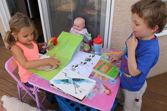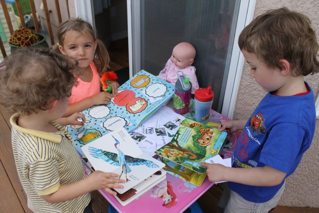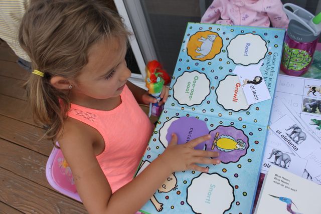 Photographed below is my niece. I gave her a book, and asked her to look through the book for animals. Once the kids familiarized themselves with their books, I would select both the Spanish and English versions of the jungle animal flashcards and tell the kids that “I spy” a lion (or another animal name). Then I asked the kids to see if they could “spy” a lion, giraffe, or other animal from the deck of cards in their books.
