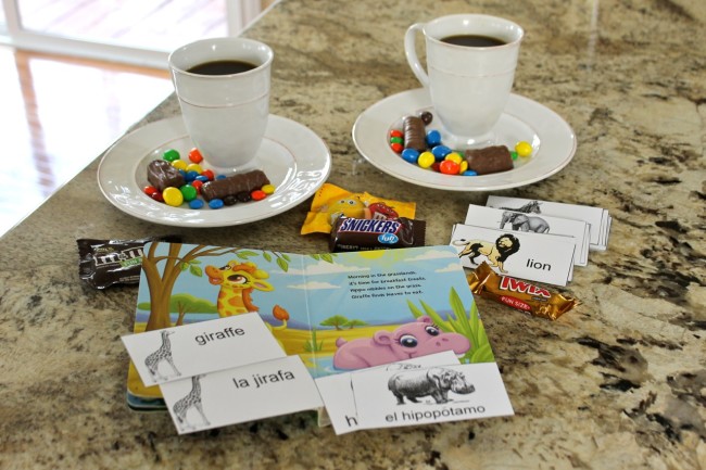 We would practice repeating the Spanish words for each of the animals and we went through a good portion of the cards before we ran out of animals in the books. Feel free to mix and match books for this learning game and try different books at each interval to keep the searching fresh each time you play. I love chocolate M&Ms and a sweet snack in the afternoon while playing with the kids is a refreshing treat!