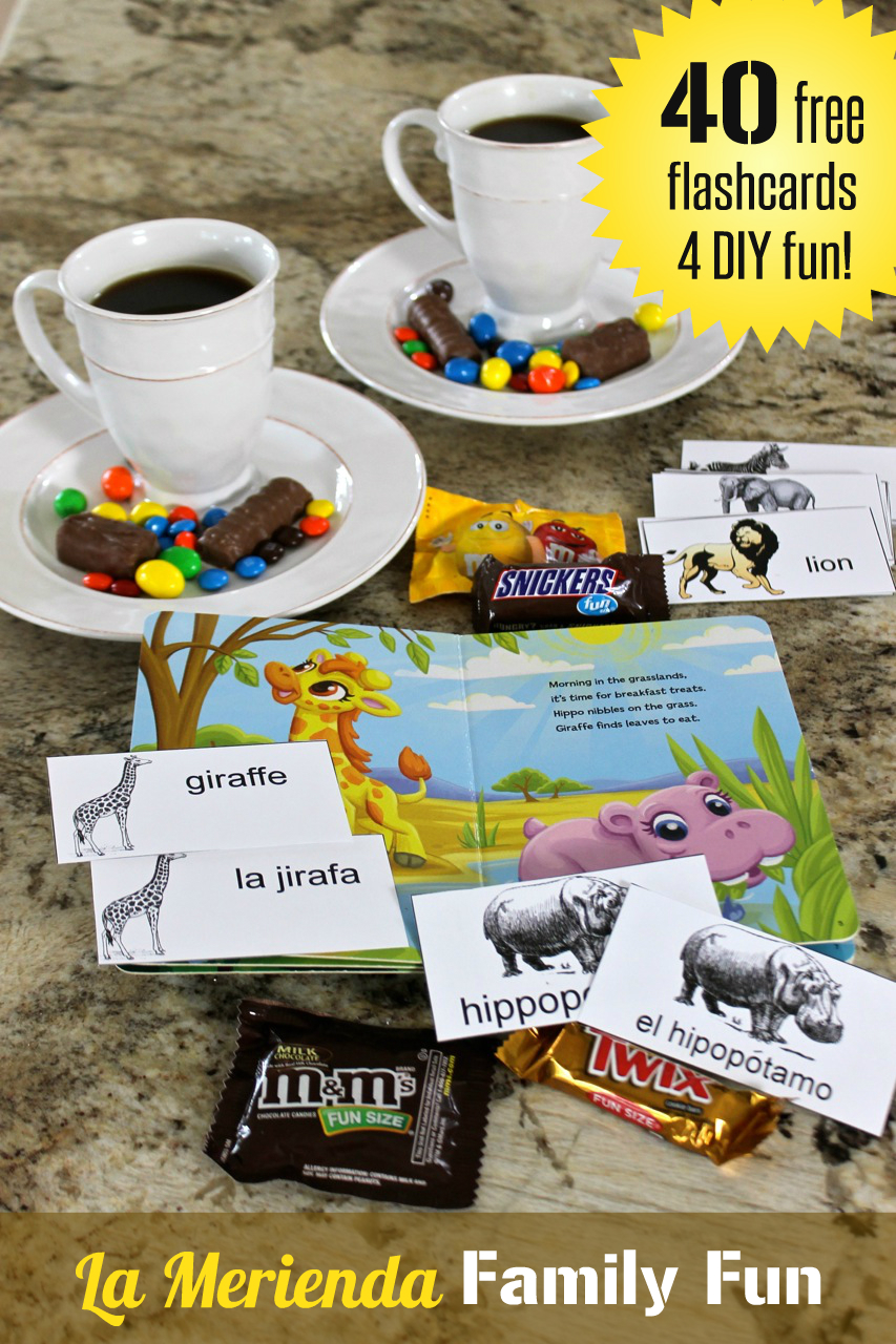 This shop has been compensated by Collective Bias, Inc. and its advertiser. All opinions are mine alone. #FunSizeMerienda #CollectiveBias. Here I’m sharing 40 Free Spanish-English Flashcards of Jungle Animals and 5 Fun Games for Kids to learn Spanish words to help families enjoy afternoon time together. The tradition of connecting with family in the afternoons with a play time and snack is known as the tradition of La Merienda in the Hispanic culture. This is one of our family’s La Merienda activities.