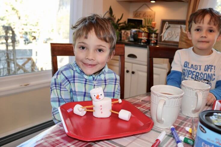 This past week we experienced one of the coldest days yet this year, 19 degrees. And sure enough, the boys asked for hot cocoa. I decided to make it into a day of fun and we built marshmallow snowmen.