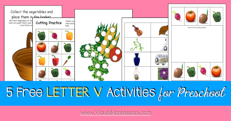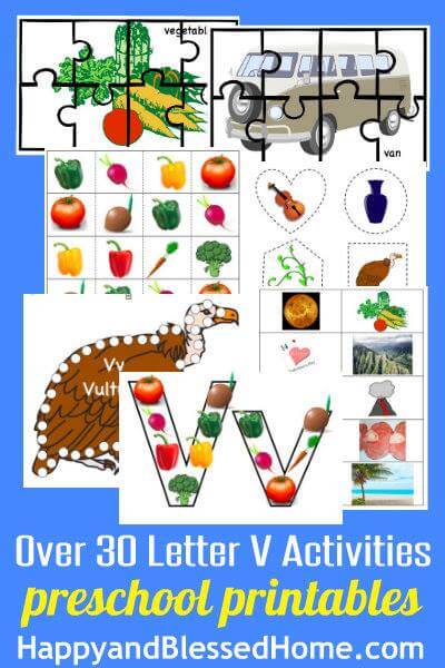 Violets, veils, vows, and vests. And we’re listening to the beautiful sounds of the violin playing on YouTube this week in our preschool at home activities at HappyandBlessedHome.com. And let’s not forget all the fun things you can do with vegetables! I’ve created a super-fun Printable Pack for 30 activities focused on learning the letter “V” and short words that start with the letter “V” and if you’re stopping by, you can pick up 5 FREE Preschool Alphabet Letter V Activities for your at-home preschool efforts and learn about our Preschool Learning Curriculum: Visual Montessori.