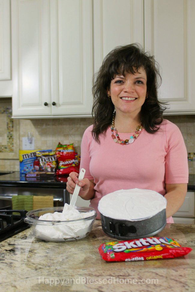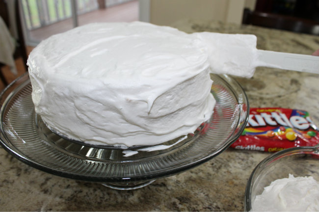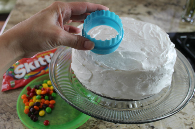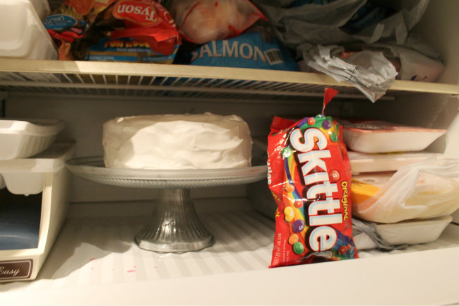 - Freeze the frosted cake. Since I planned to decorate both the top and sides of my cake, I placed both the cake and Skittles® candies in the freezer.