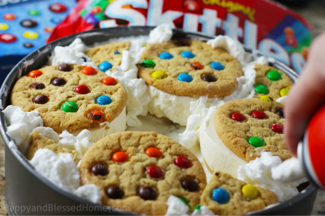 Once you’ve filled the bottom of the pan with M&M’s® Cookie Ice Cream Sandwiches, fill in any gaps using whipped cream.