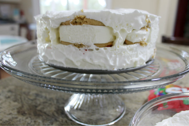 Using a flat spatula, frost the sides of the ice cream cake with cool whipped cream.