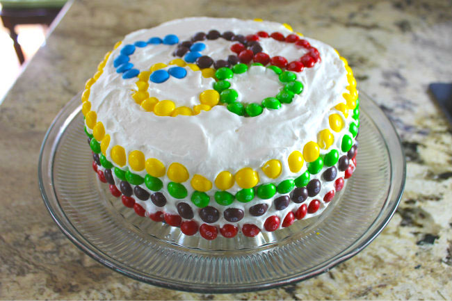 This Ice Cream Cake can easily be decorated with Skittles® and M&Ms® Easy Ice Cream Cake Recipe by HappyandBlessedHome