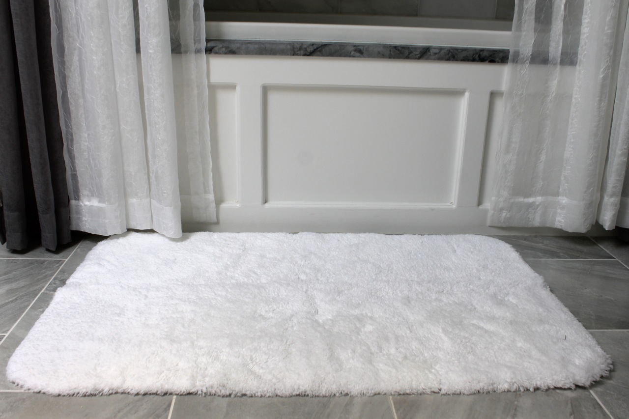 Here’s the “after” photo of our bath mat. Dingy bath mat all clean. Voila’ – I love decorating in white!