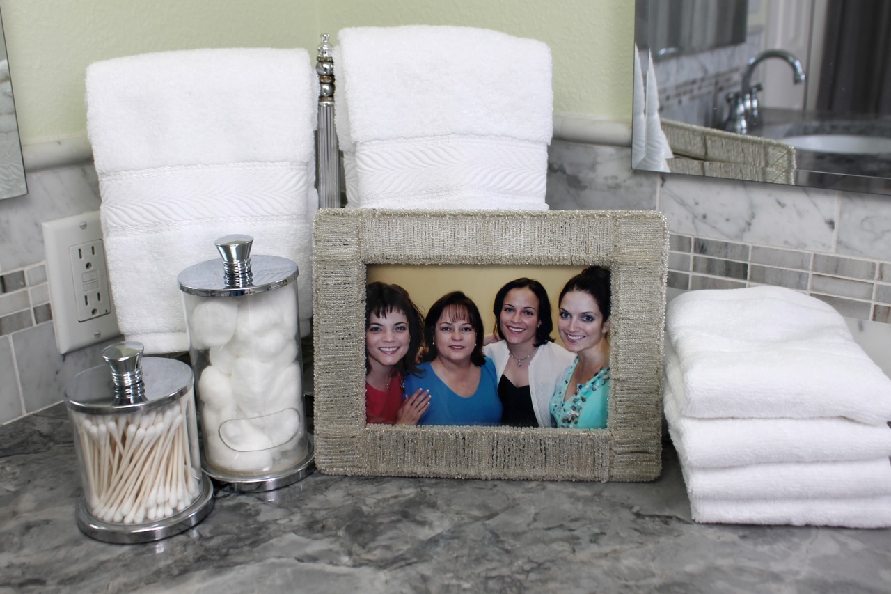 1. Add a pop of color. Don’t be afraid to partner white with pops of color. The bright pink flower in the center adds just the right touch of color to our master bath. I painted the walls a spa green and added my favorite green colored towels. Just the right amount of color to make for a soothing spa-like retreat.