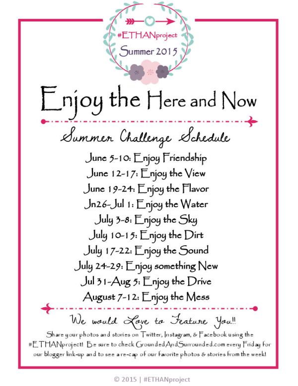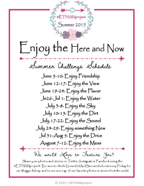 - Download the Schedule: Every week for 10 weeks the #ETHANProject bloggers are posting and sharing about one of the simple inspiring ways we can capture the essence of Summer. Here is a list. Put it on your fridge or download to your smartphone. Be inspired by the simple reminders to seize the day every day this summer! Just click the image to enlarge it and print it off at home. Right mouse click to save it to your computer or phone.
