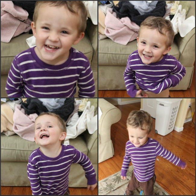 2. Do a Laundry Dance. Gather up all the laundry and make two piles – a clean pile and a dirty pile. Pile the clean pile somewhere where you can easily get to it and fold it. Enlist the help of your kids and do the “laundry dance”. Here my three year old son will illustrate – it’s a bit like a rain dance. Just sing a tune and dance around in circles – see – doesn’t that make laundry day more fun?