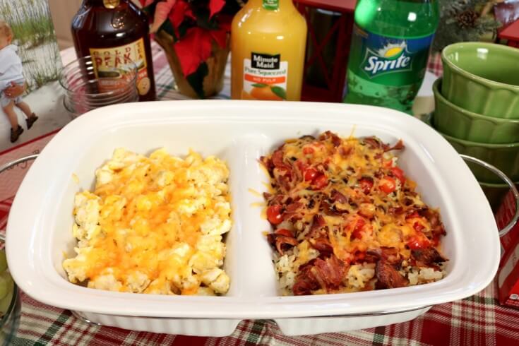 In the morning, put the Hash browns, Eggs and Bacon Breakfast Casserole in the oven and reheat for 20-30 minutes at 300 degrees and it will be ready when guests arrive or wake up. For our family brunch I used a divided casserole dish and I cooked up some extra scrambled eggs to offer even more protein options.