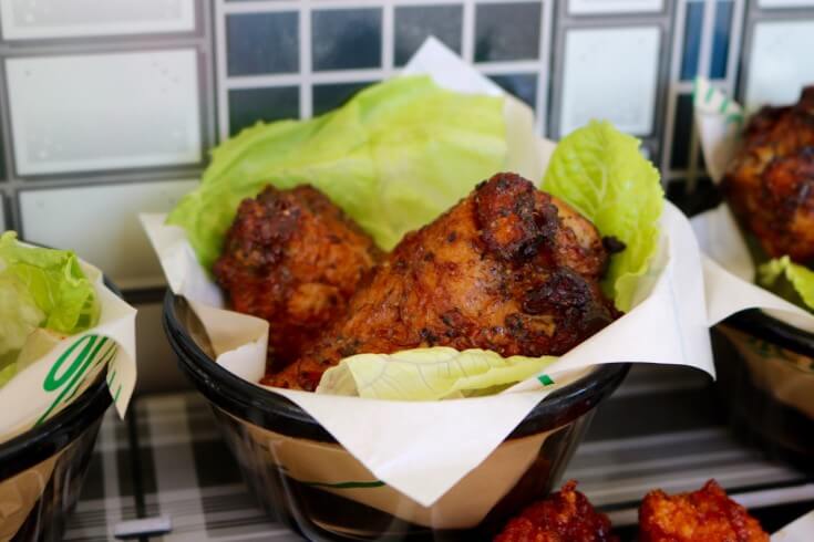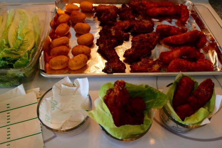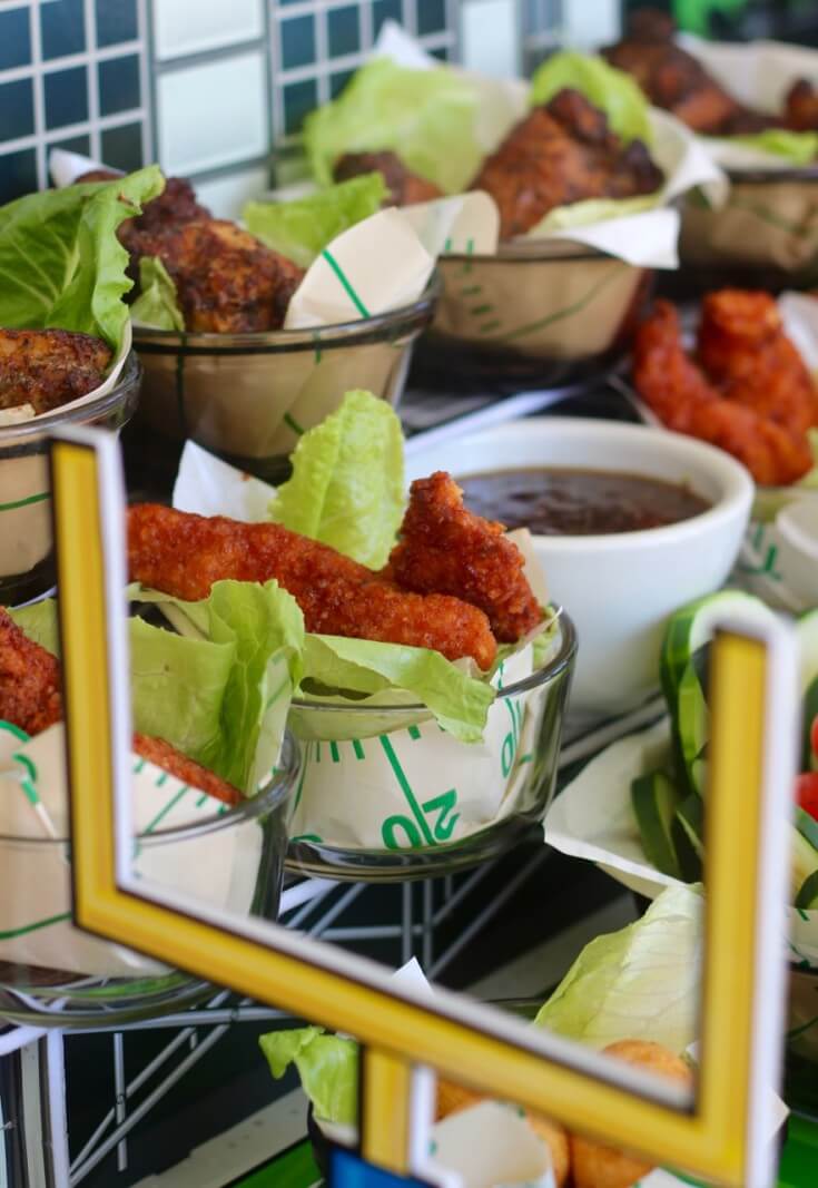 I added a layer of Romaine lettuce and topped each bundle with Tyson® wings. The display is very easy to make, and it offers guests an easy way to pick up a bowl without having to dig through a casserole dish.