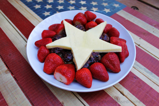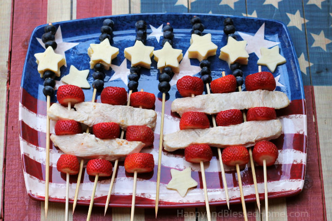 - For the blue and white skewers use star cookie cutters to trim hunks of cheese into stars. Thread the stars onto skewers and add blueberries on both the tops and bottoms of the cheese stars.