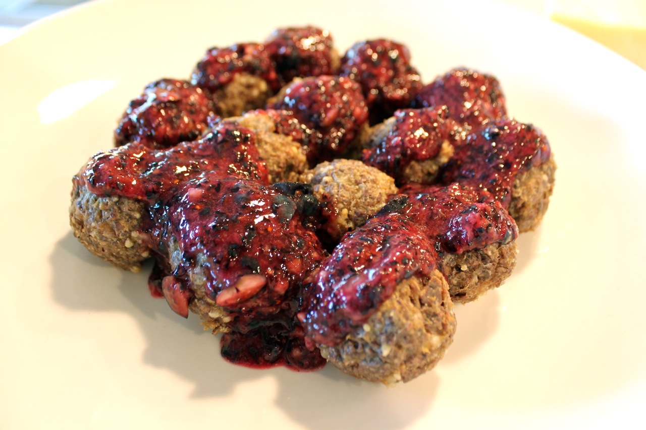 - Using a food processor, pulverize 1 Cup of blueberries and pour them over the top of your turkey balls.