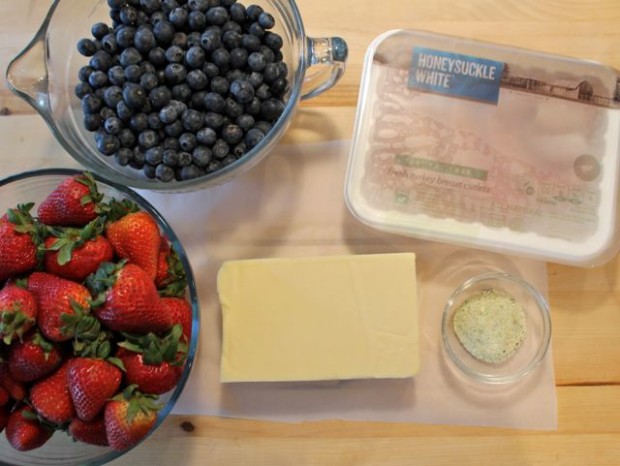 - Thread two or three skewers trough the turkey breast cutlets with strawberries on both the tops and bottoms of the cutlet strips.