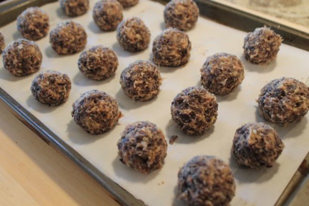 - Using your clean hands, roll portions of the mixture into two-inch balls and place on a parchment lined cookie sheet to bake.