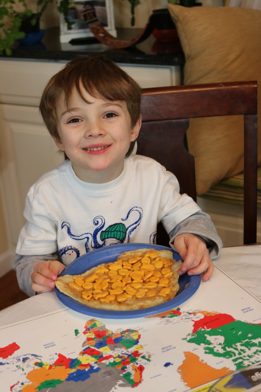 For this Peanut Butter and Goldfish® Cracker, Flatbread Sandwich, we simply spread on some smooth peanut butter and the boys added their goldfish crackers on top. Tasty fun for everyone!