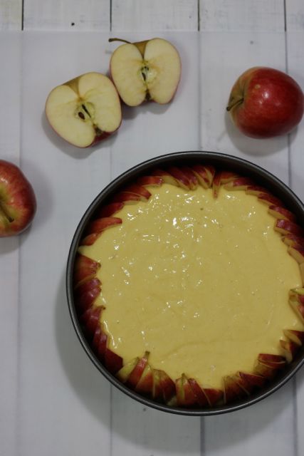 2. Prepare the Apples – Core and slice your apples, you will probably need 4-6 depending on the size of the apples. Don’t worry about peeling them (it looks better if you leave the peel on). I am using Gala apples for this cake but you can use your favorite variety. You will want to slice your apples into approximately 1/2″ wedges. Gently place your apple slices around the perimeter of your cake pan, peel side facing out. Pour your batter into your cake pan.