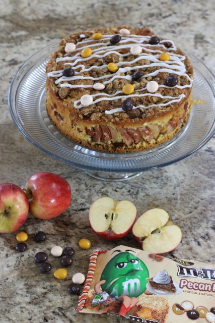 6. Allow the cake to cool and add the Candy Topping – Once your cake is completely cool, have a little fun and make it pretty! I added some drizzles of cookie icing to my cake with my Dessert Decorator Plus and topped it with M&M’s Pecan Pie candy pieces. The colors of the candy add a little pizzaz to this extraordinary cake, and no matter what part of the cake you cut into with a fork, you’ll have a delicious mix of apple and candy flavors in every bite.