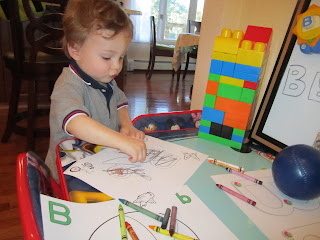 I know every parent feels this way, but I think our little man is so smart! He has an incredible vocabulary and truly grasps the meaning of so many words. It’s wonderful to be able to communicate with him. This week, I created a learning center around the letter “B” and I plan to do a new letter every few days. The set-up included a sensory basket full of toys that start with the letter “B” and a magnet board with flashcards and our ever-favorite Leap Frog phonic sounds learning tool.