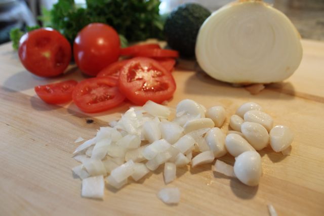 - The onion and garlic in the photo above were used in the black bean salsa – more on that below