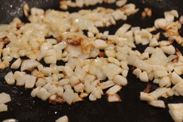 Step 6 -While the beans simmer, heat a medium sized frying pan for cooking the onion and garlic. Add a pat of butter to the pan. Once the butter starts to brown the pan is ready.