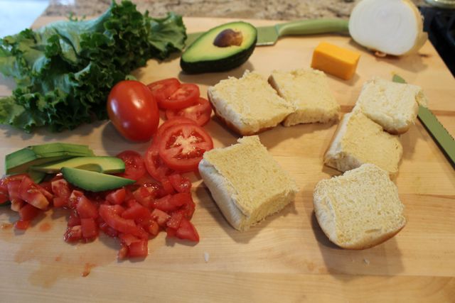 Step 13 – Keep your patties warm in the oven while you prepare your toppings. I cut the bread rolls, tomatoes, avocado and lettuce while batches of patties were cooked; and while the salsa simmered.