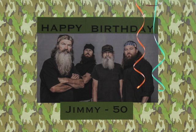 I made this easy party sign made with a Duck Dynasty image I found online pasted onto camouflage wrapping paper.