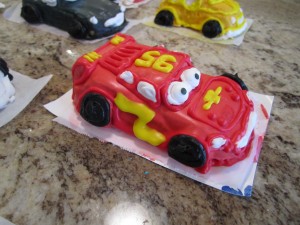 Pre-filled applicators helped with the primary colors and candy eyes made those super-quick to apply. I followed the directions on the blog for the brown and black icing by mixing in chocolate for the brown and a store bought black.