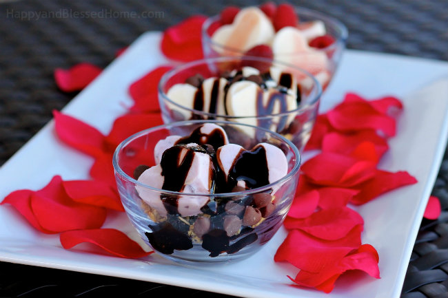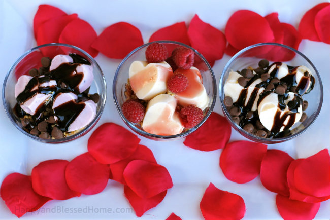 Step 5: Layer the frozen yogurt shapes on top of the granola. For my parfait glasses and bowls, I added three of my heart-shaped pieces of yogurt.