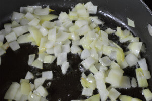 Sautee onions until they soften for this tasty Cheese, Clam & Shrimp Stuffed Poblano Pepper recipe