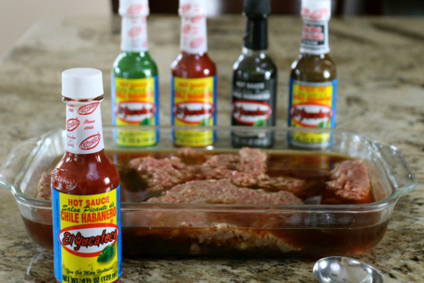 1. Cut the cubed steak pieces into strips. Place the meat fingers into a deep dish. Pour the marinade mixture of El Yucateco Red Hot Sauce and beef broth over the steak pieces. Cover the dish and marinade for at least an hour or up to overnight to cook the next day.