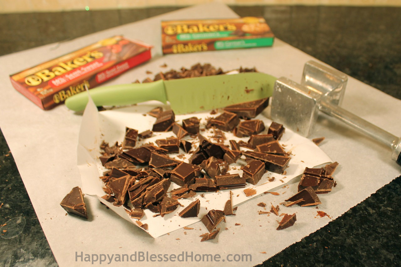 Step 5: Cut up and add chocolate. I like a rough-hewn appearance to my chocolate. I use a sharp knife and mallet to cut it. I inserted a few pieces of chocolate on the sides of each loaf and then sprinkled the rest on top halfway through baking. You can also fold the entire batch of chocolate into the batter. It’s entirely up to your personal taste and preference. Baker’s chocolate is available in unsweetened to sweetened and everything in-between. You can use any flavor to create this recipe – all of them are delicious. Since I used two bars, I saved a half a bar to create a chocolate drizzle for my loaf. I drizzled the chocolate on top after the loaves finished baking.